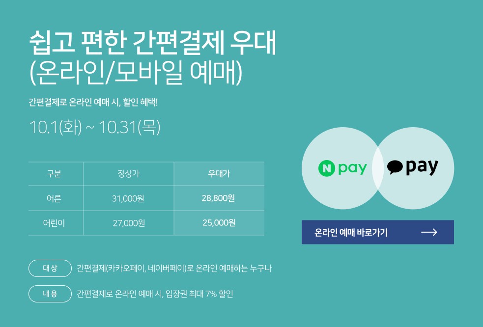 현재 가장 간단하게 결제 할인을 받는 방법으로 간편결제 우대가 있습니다. 하지만 가장 간단한만큼 할인율을 적은편인데요. 또한 온라인 예매로만 할인이 진행되기 떄문에 미리 예매를 해야합니다.