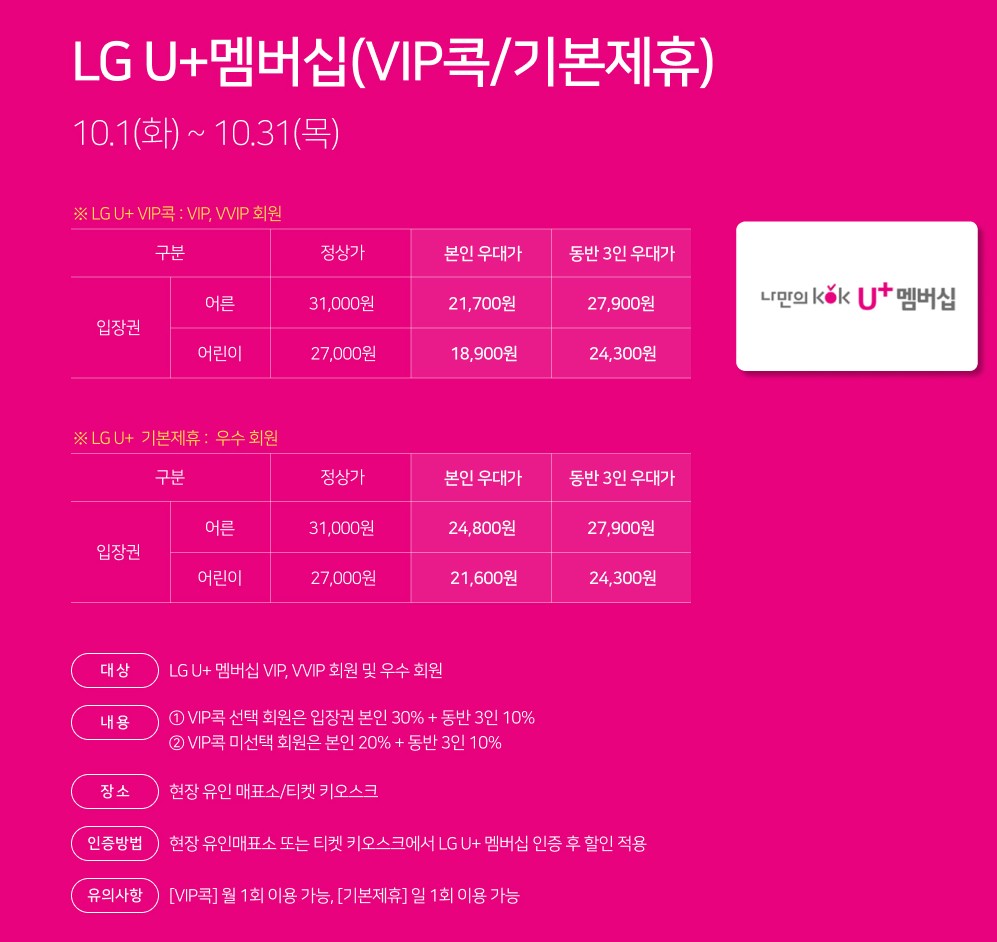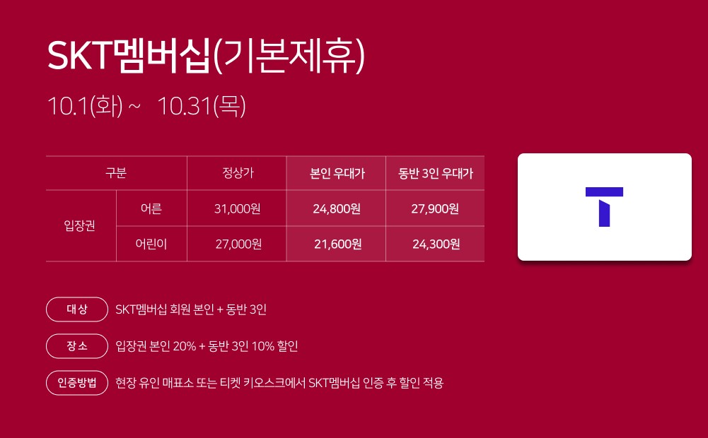 SKT, KT, LG U+ 통신사 할인이 가능합니다. 각 통신사별로, 회원 등급별로 할인율이 다르니 확인 후 예매하시길 바랍니다.