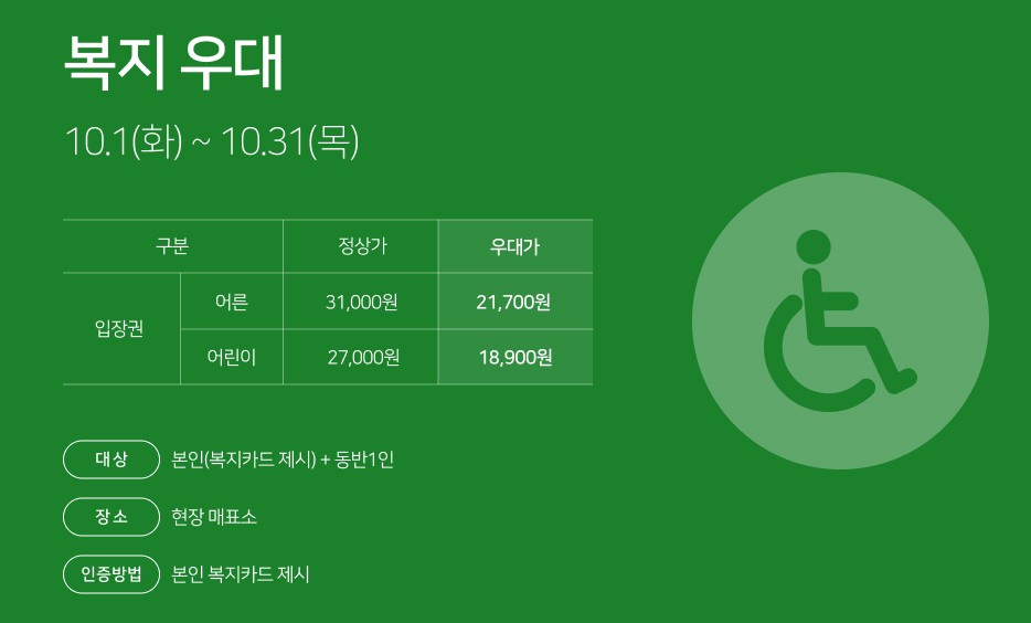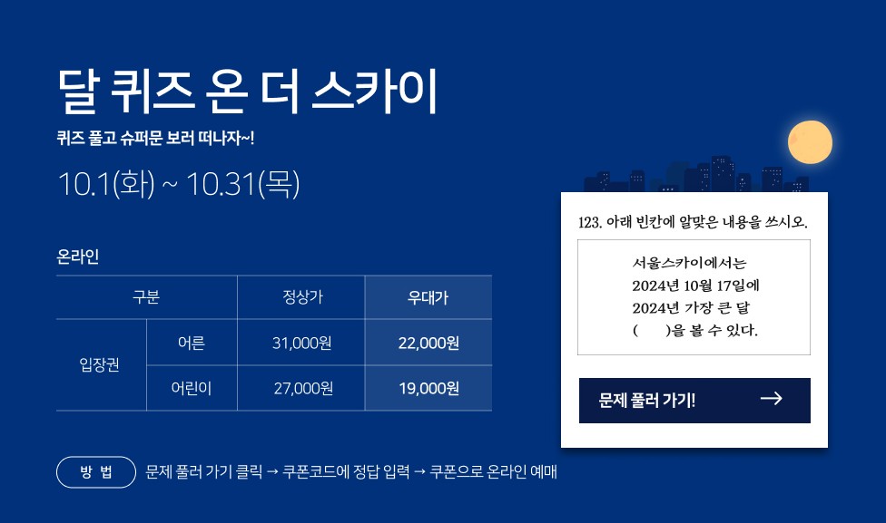 기본적으로 매월마다 복지우대, 임산부 우대, 시니어 우대는 진행되고 있습니다. 또한 특정 기간 동안 진행되는 이벤트나 프로모션을 통해 추가 할인 혜택을 받을 수 있습니다. 예를 들어, 2024년 10월에는 슈퍼문 관련 이벤트를 진행중으로 퀴즈를 맞추면 할인 코드를 증정합니다. 이외에도 시기별로 계속 할인 이벤트가 진행되니 꼭 홈페이지를 확인해 보시길 바랍니다.