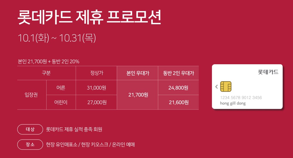 롯데카드, 삼성카드 등 특정 카드로 결제 시 추가 할인이 제공됩니다. 할인율이 높은 편이지만, 전월실적 여부와 혜택이 적용가능한 카드가 다 다르기 때문에 본인이 소지한 카드를 확인해야합니다.